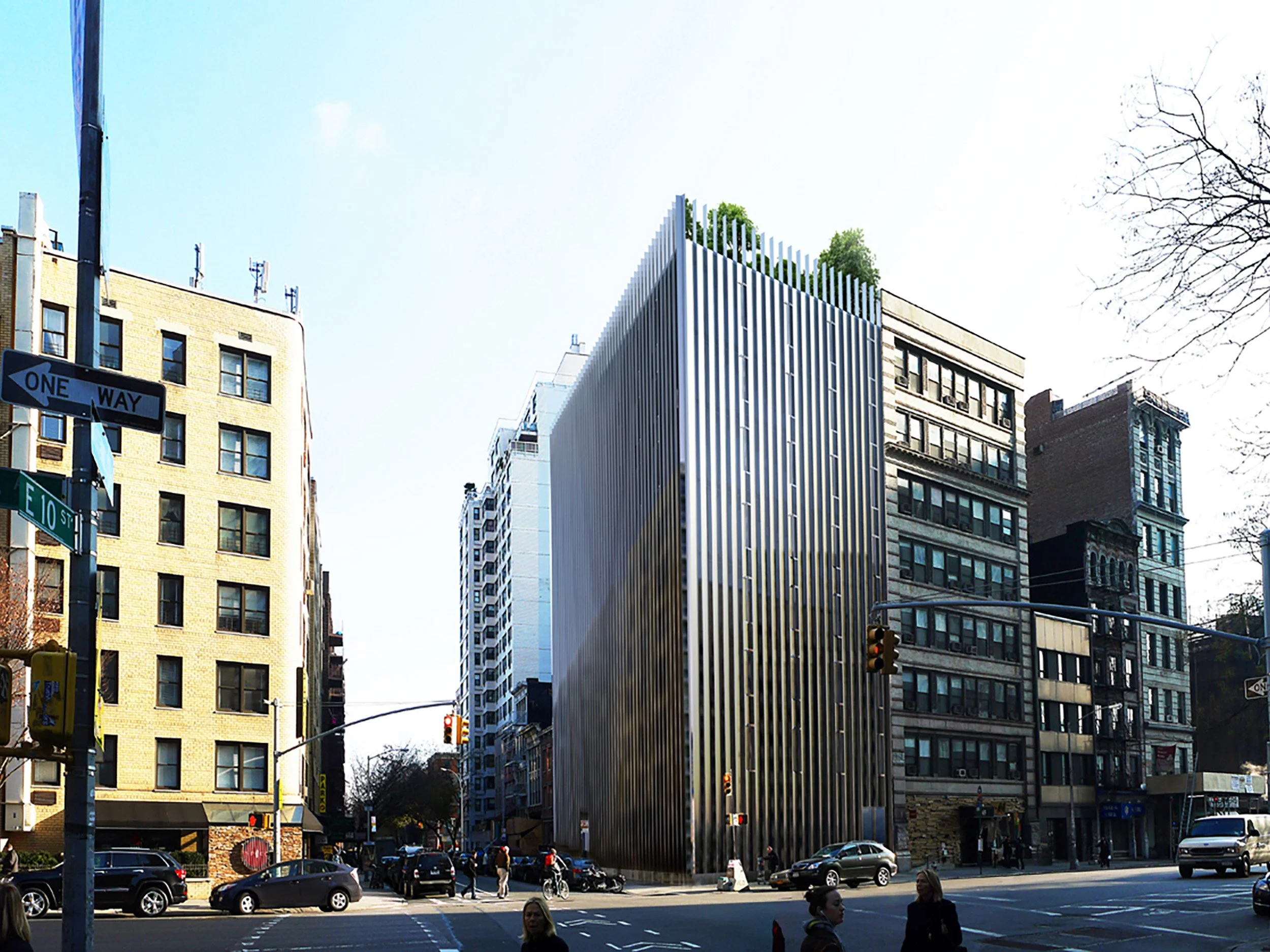 The building is located on a busy intersection, in the highly dense neighborhood of the East Village in New York City. The premise of the design was to create a residential building with a transparent glass skin that allowed visibility out towards the city yet protect from direct views into the individual apartments. This was accomplished by creating vertical stainless steel fins that are centered every two feet and extend perpendicular from the glass out from the building 12”. This assembly allows for views in or out of the building, creating very specific and directed views. The fins are polished stainless steel on one side and brushed stainless steel on the other. The polished side adds dimension and depth of visual space.