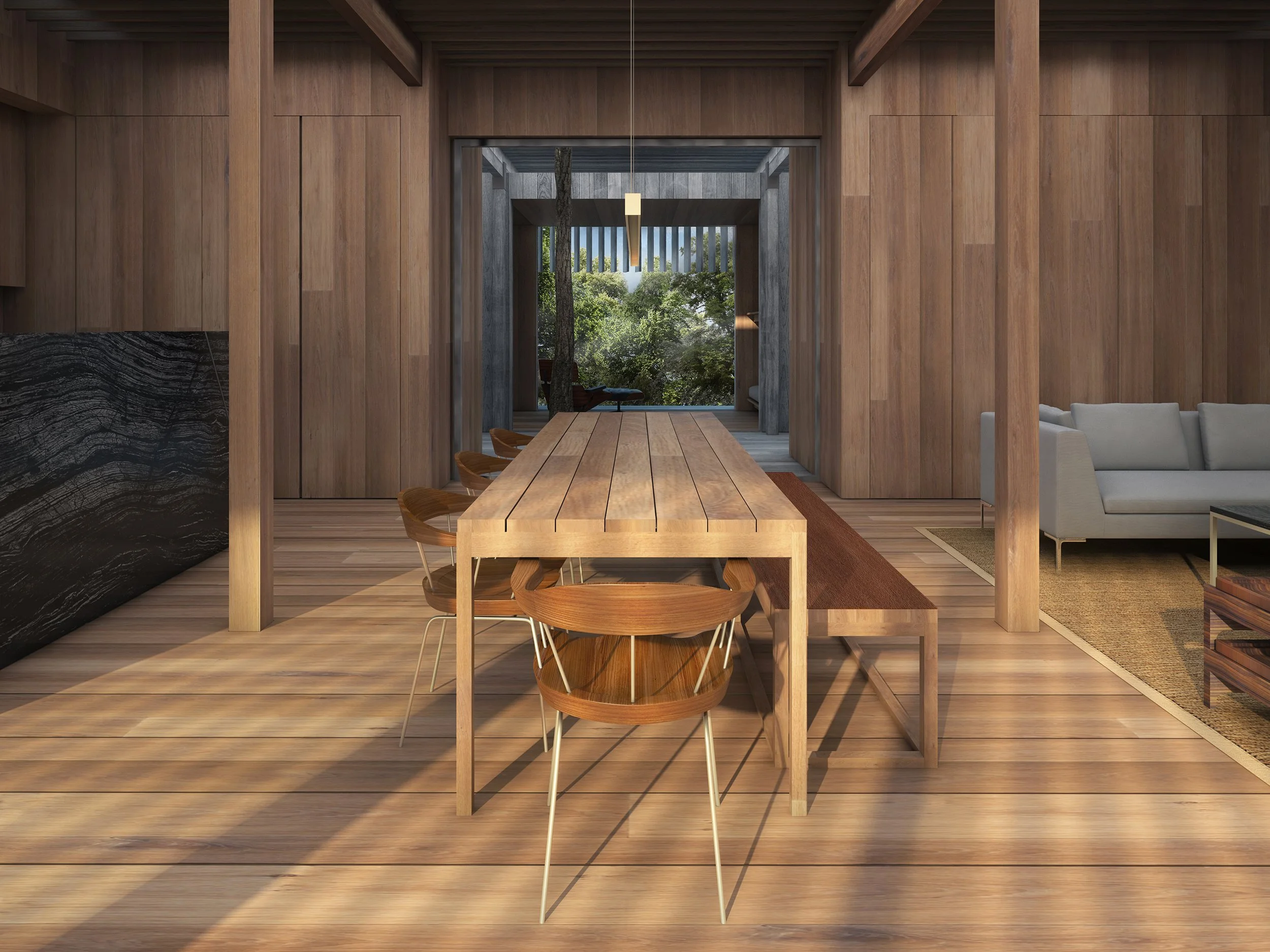 The principal rooms, which open out to a broad veranda through floor-to-ceiling glass sliders, are arranged to capitalize on spectacular ocean views. A long vista that extends from the entry, through the house, and out to the water underscores the intimate connection between the structure and the sea. The walls, floors, and ceilings of the interior spaces are clad in planks and beams of cedar and oak that create a warm, cocooning effect. Balancing various degrees of transparency and opacity, the rooms are designed to suggest a sense not only of unfolding space but also multiple experiences. Ultimately, the site-specific architecture offers a compelling solution to the dilemma of living graciously in nature, at one with the beauty of the landscape, without feeling exposed and vulnerable to the elements.