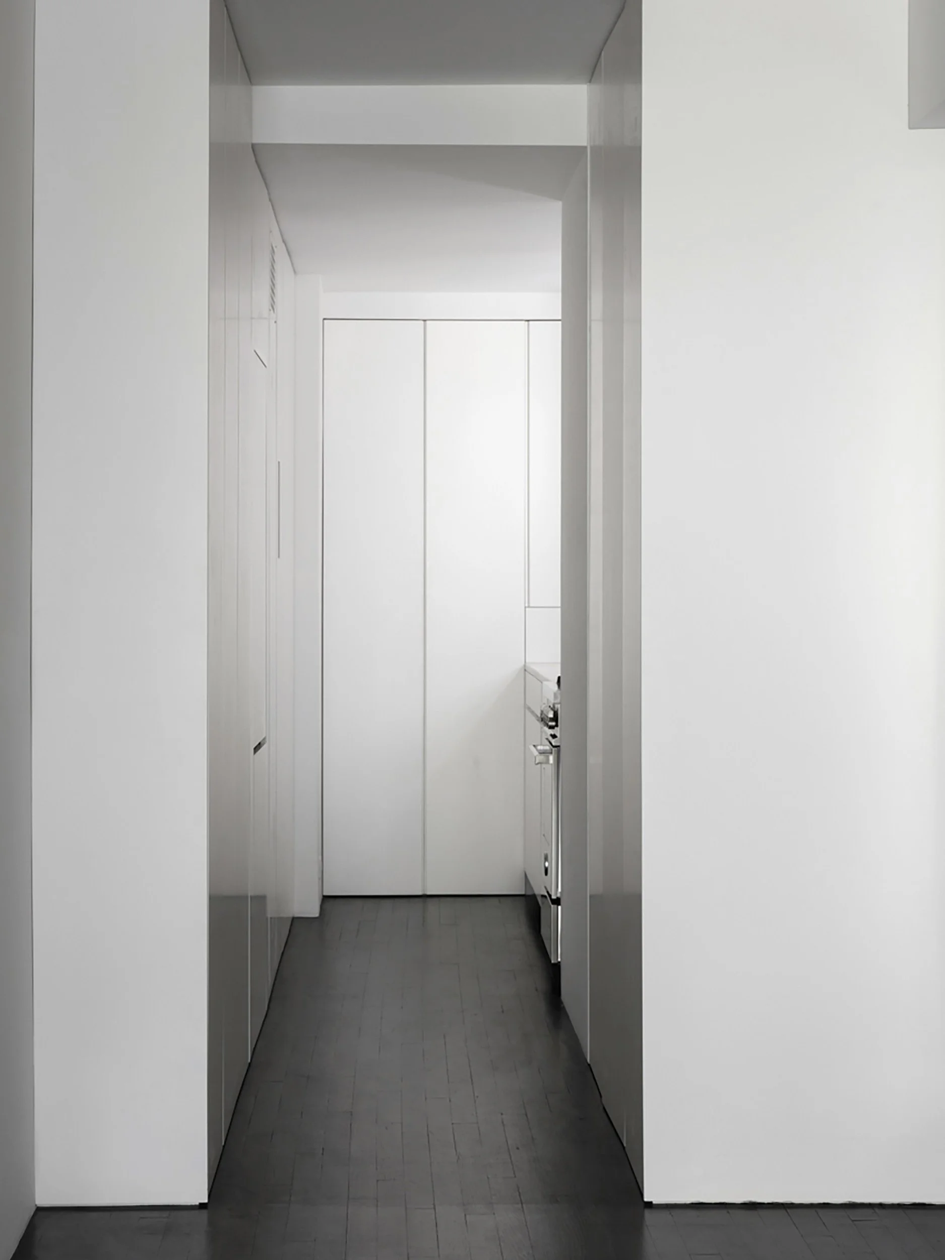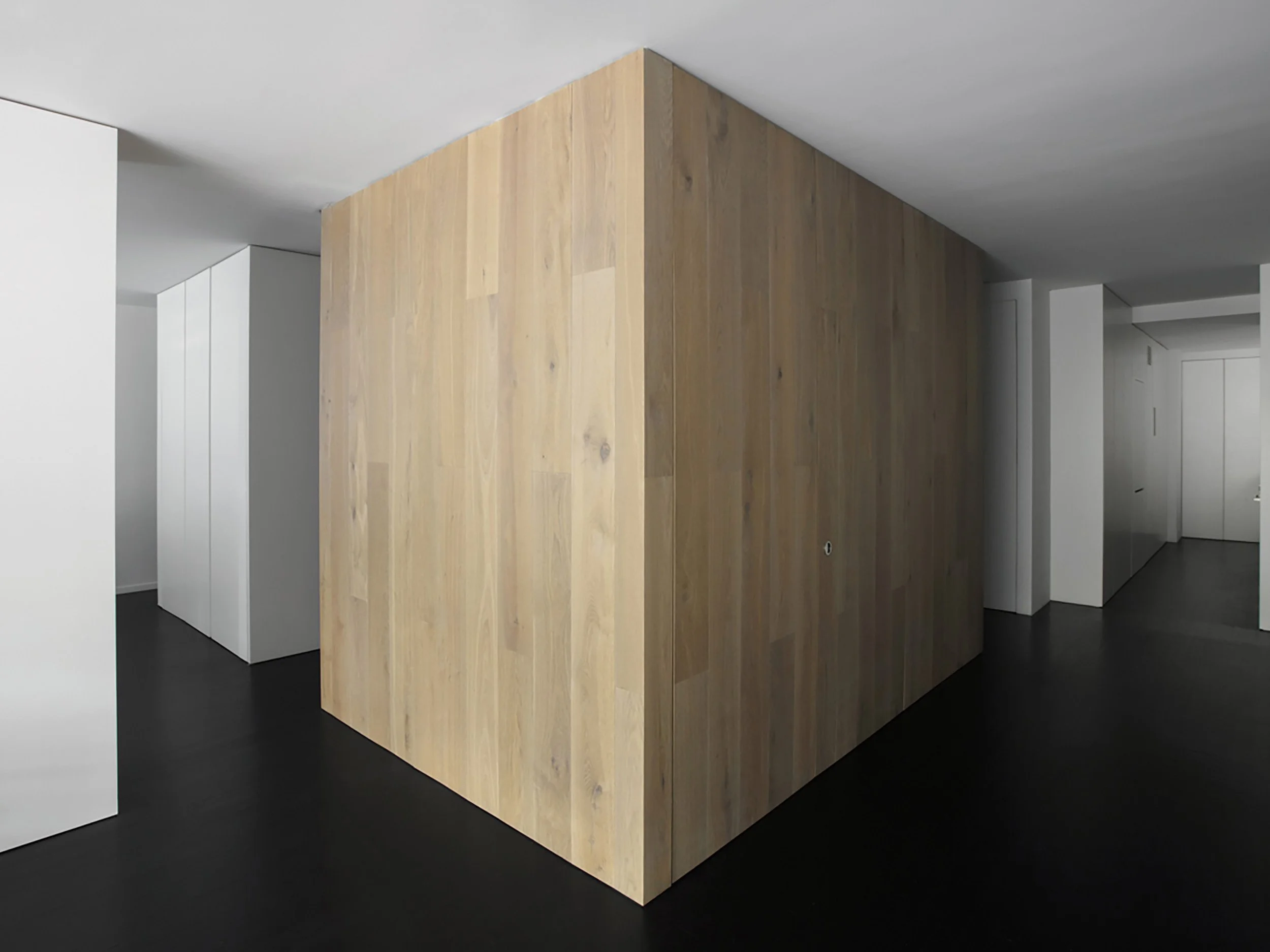 Throughout the loft, stained black floors contrast crisp white walls. A slight gap at the bottom and top of the containers heightens the apartment’s loft-like character. The oak paneling and visible graining on the wood floors introduces organic texture to the otherwise restrained materials palette. In the kitchen, tall, semi-gloss white cabinet doors comprise the kitchen’s back and side walls, camouflaging prep and storage areas.