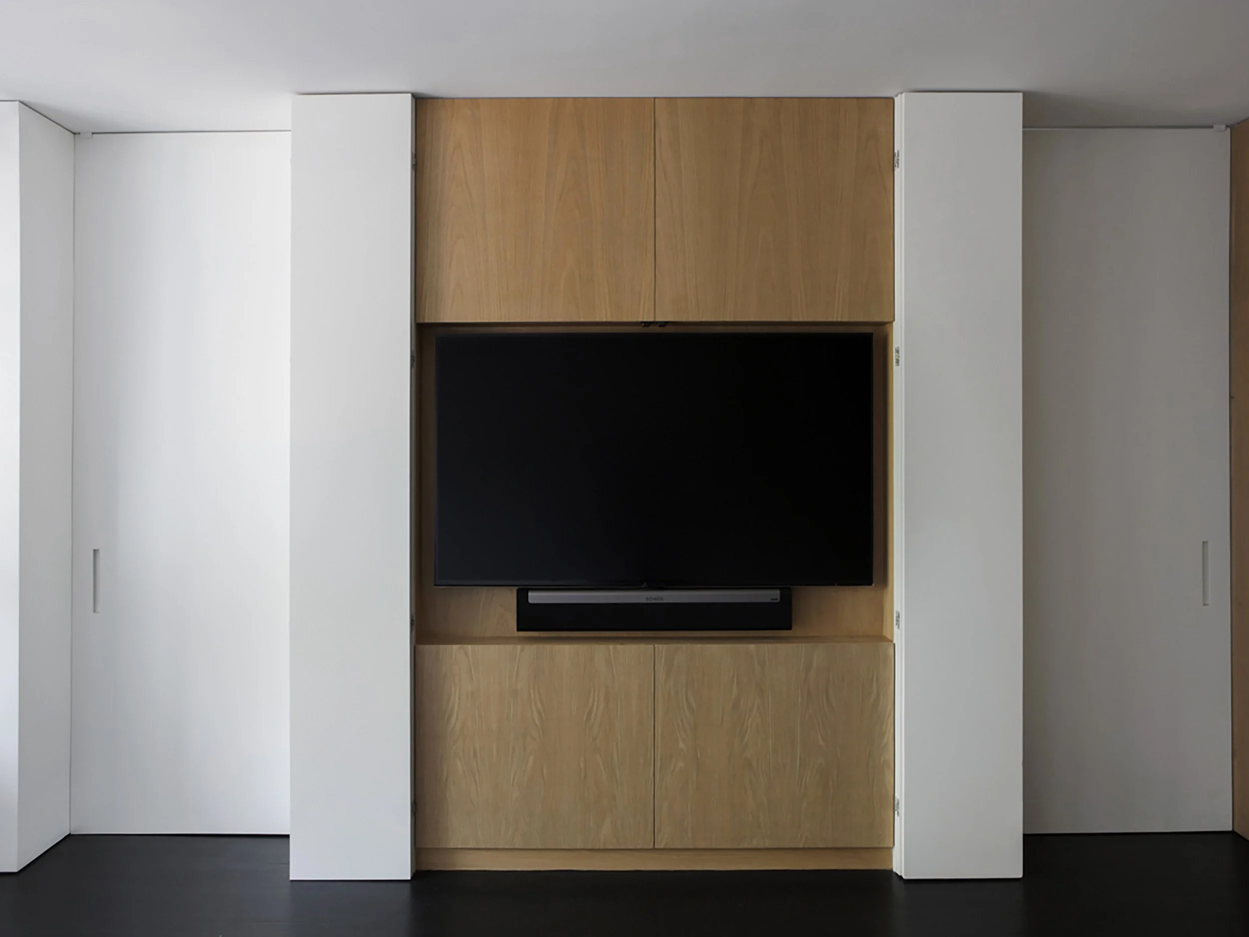 In the living room area, a tall, freestanding, white box partitions the bedroom and allows the living room to function as two diametrically different spaces: a serene, meditative space with the box closed or an entertainment area when the front panels are collapsed to expose the television and oak cabinets. In the bedroom, panels on each side of the unit fold out to completely close off the two rooms. A long, built-in desk is tucked beside a structural column and under the windows with views of the park. A third, large container houses the bedroom closet and bathroom with a hinged panel to cordon the room from a hallway. When closed, sight lines from the foyer extend through to the eastern-facing windows.