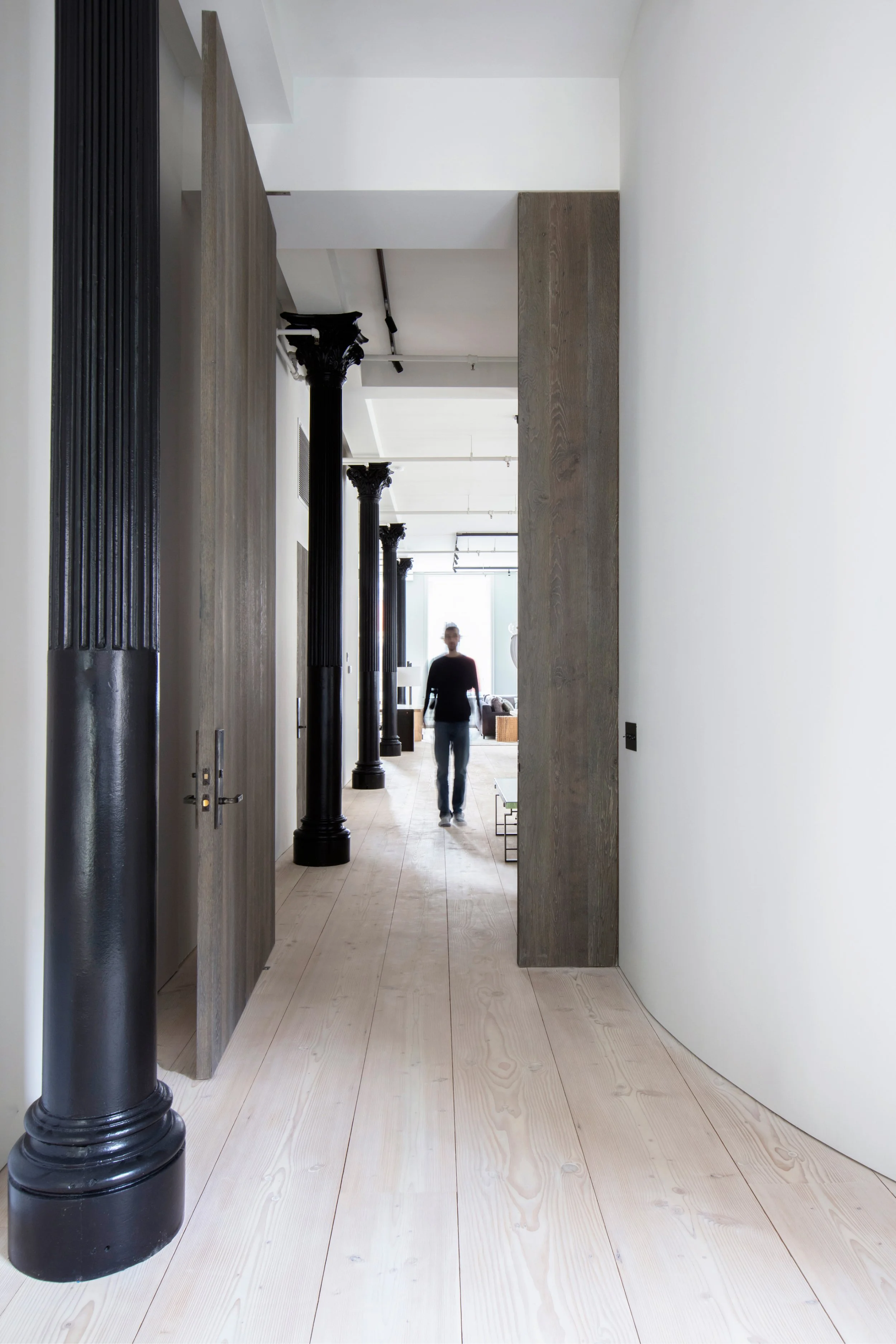 Defying logic, this downtown loft demonstrates how contrasting materials and forms can be united to create a superbly composed and harmonious private residence. The juxtapositions—dark and light, rough and smooth, metal and wood, grained and glossy—cohere into a design that is polished yet gritty, warm yet audaciously modern. The client purchased the SoHo floor-through as a pied-à-terre for frequent stays in New York City. The interior had been stripped of its industrial heritage except for the antique, 12-foot, Corinthian cast-iron structural columns that now appear as sculpture punctuating the length of the apartment.