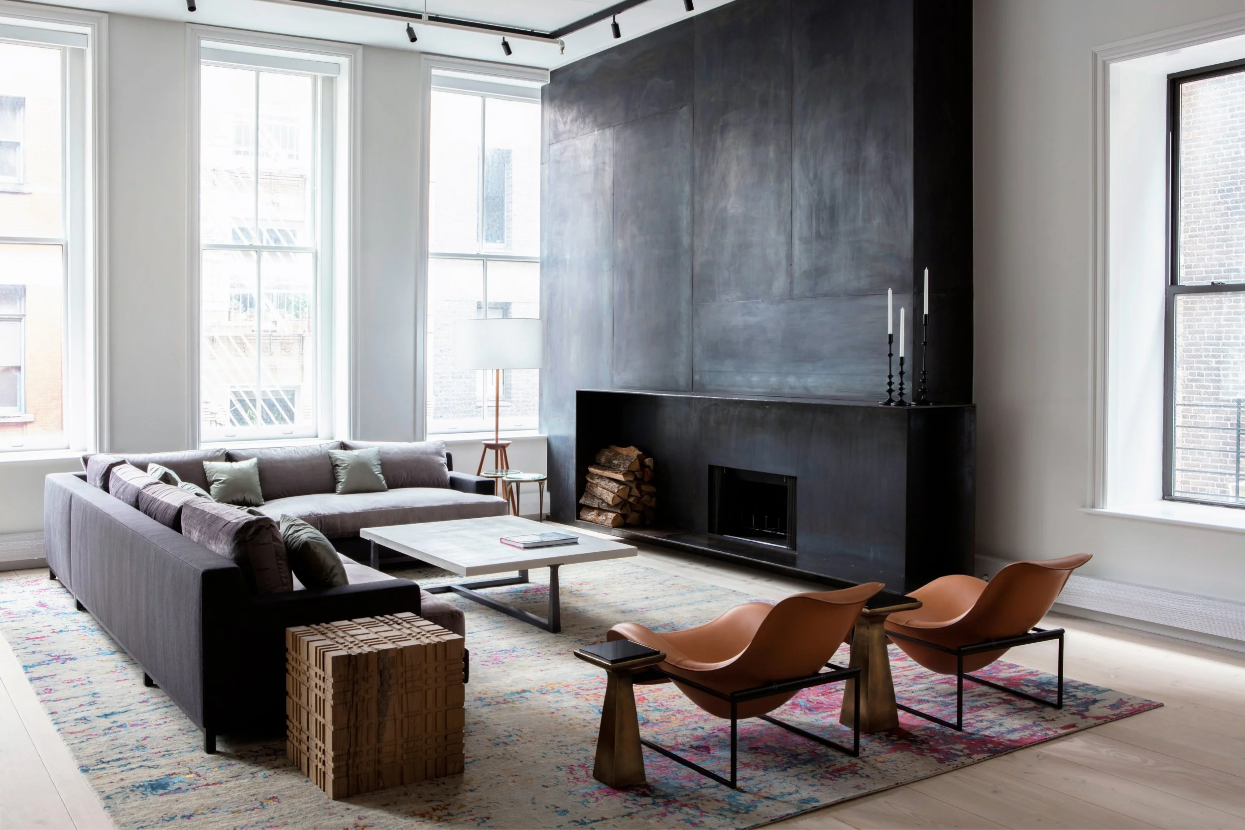 Originally a three bedroom, we removed a partition to transform one bedroom into an open-plan study. New Danish softwood floors of century-old Douglas fir planks, which are a foot wide and two-inches thick, create a sumptuous foundation to the 3,000-square-foot space. The columns were scraped clean and fireproofed with shiny black paint which subtly accents the fluted sides and Corinthian capitals. In the main living area, a minimalist fireplace and hearth are contained within a 12-foot, blackened steel architectural surround amid clean white walls and deeply recessed, double-hung windows framed in simple white trim. The open kitchen has a black Boffi island and cabinets in black oiled steel. Stainless steel rod pulls, fixtures and a cylindrical, overhead lighting fixture reflect daylight from adjacent windows. A custom, rough-hewn wood plank table on stainless steel legs abuts the sleek island for casual dining and additional prep or buffet area. Over the dining room table, a branching, 10-light chandelier is a custom sculptural installation by Lindsey Adelman Studio.