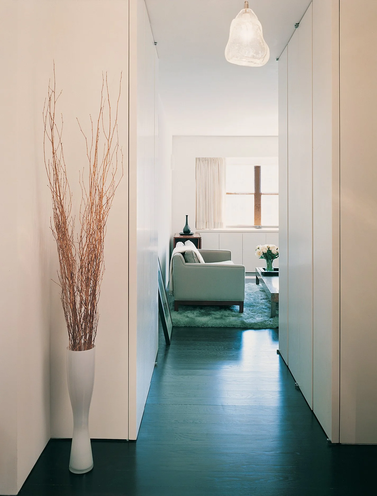 A strangely long and wide entry foyer, which originally extended from the living room, was redesigned as a square volume with white lacquered panels and doors, creating a narrow passageway to the main living space. This new configuration opened up area for deep closets and a home office in the original coat closet. The kitchen, adjacent to the foyer, was extended into a broom closet and refitted with Ashe and stainless-steel cabinetry and under-counter appliances.