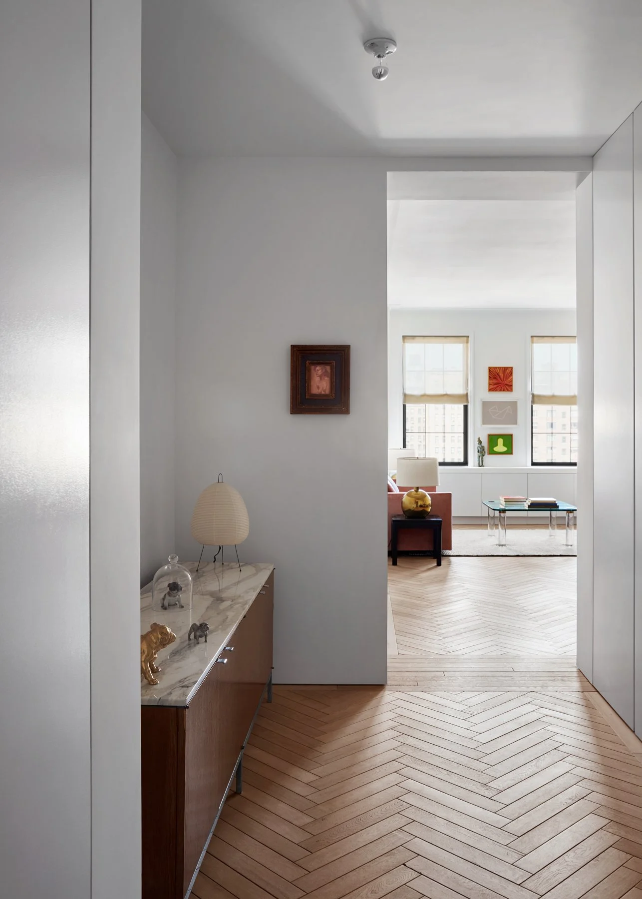 The spirit of this Upper West Side apartment emerges from the illusory time warp—a gentle push and pull between the comfort of the past and the vigor of the present—embedded in the architectural details. A new floor of reclaimed oak boards, laid in a herringbone pattern and finished in natural oil, has the romantic allure of an old European pied-à-terre. In the living room, den and bedroom, we recreated an original plaster relief detail suggestive of a crown molding, a small segment of which was uncovered during demolition beneath a dropped ceiling in the bedroom. Juxtaposed with these more traditional elements, our modernist interventions—including the storage blocks that flank the entry hall—vibrate with particular vigor. The link between the past and present becomes explicit in the vestibule between the living/dining area and the apartment’s more private spaces, where a traditional baseboard, again original to the apartment, segues abruptly into a quarter-inch reveal that lifts the walls off the floor.